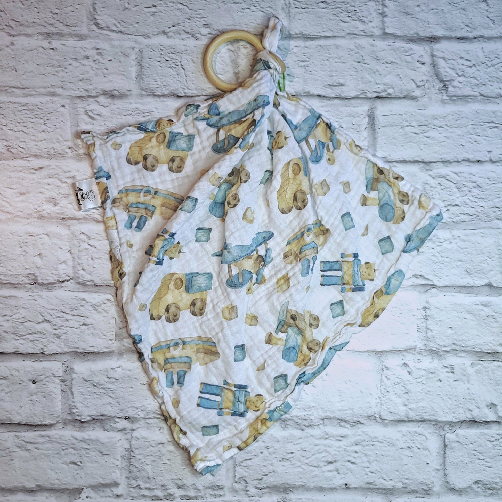 La douceur d'une mousseline sur une anneau de bois fera le bonheur de bébé en soulageant les gencives lors des poussées dentaires tout en le réconfortant.