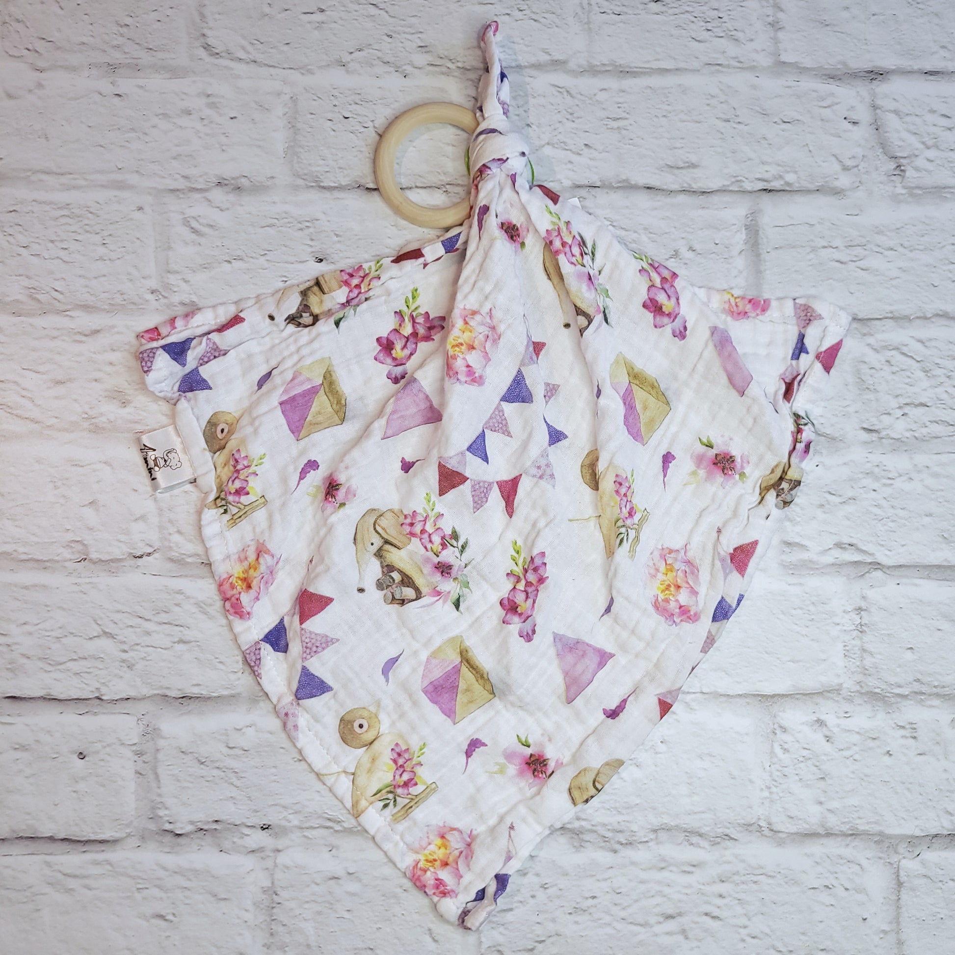 La douceur d'une mousseline sur une anneau de bois fera le bonheur de bébé en soulageant les gencives lors des poussées dentaires tout en le réconfortant.