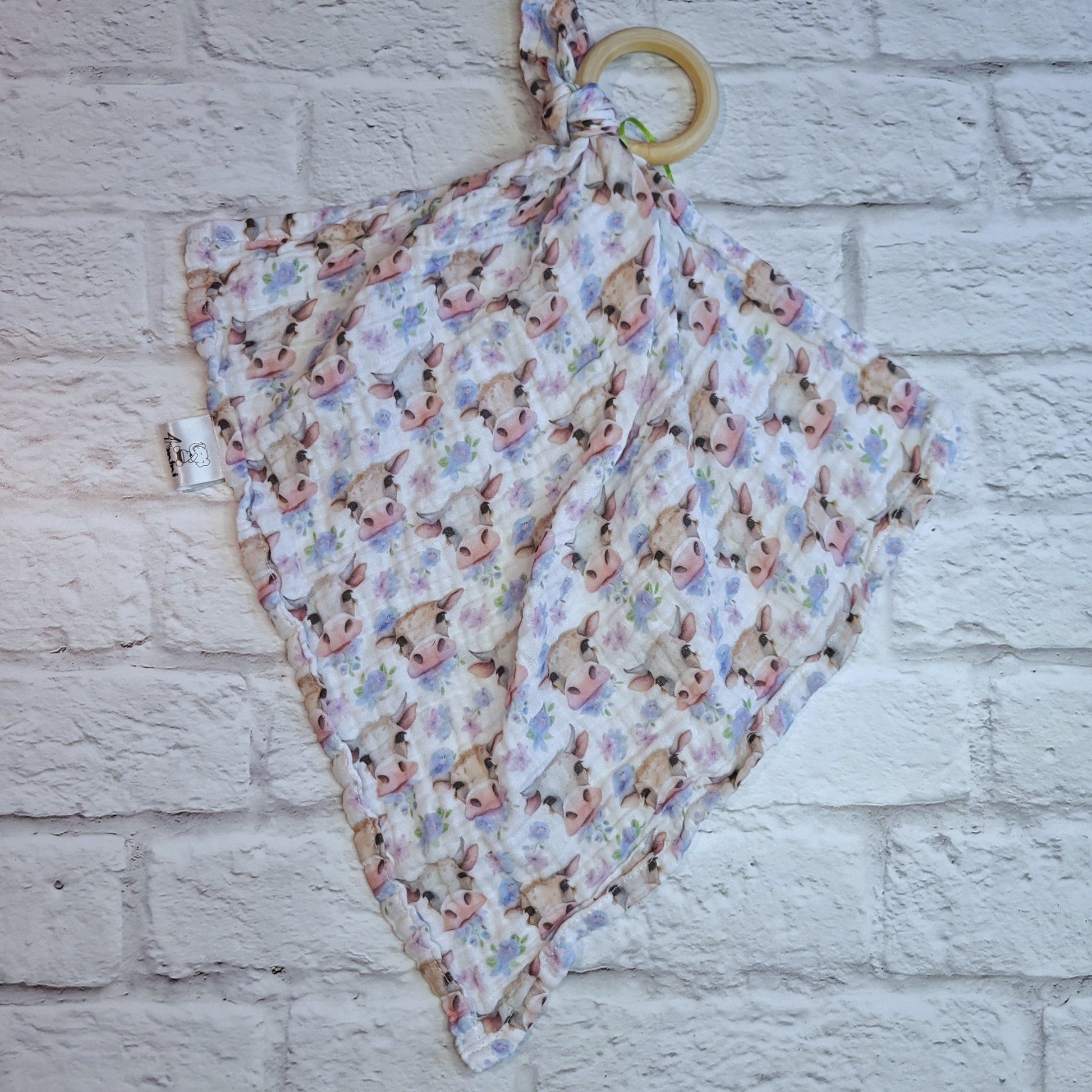 Simplement fixé à l'aide d'un noeud, la mousseline peut également servir de mini doudou passe-partout.