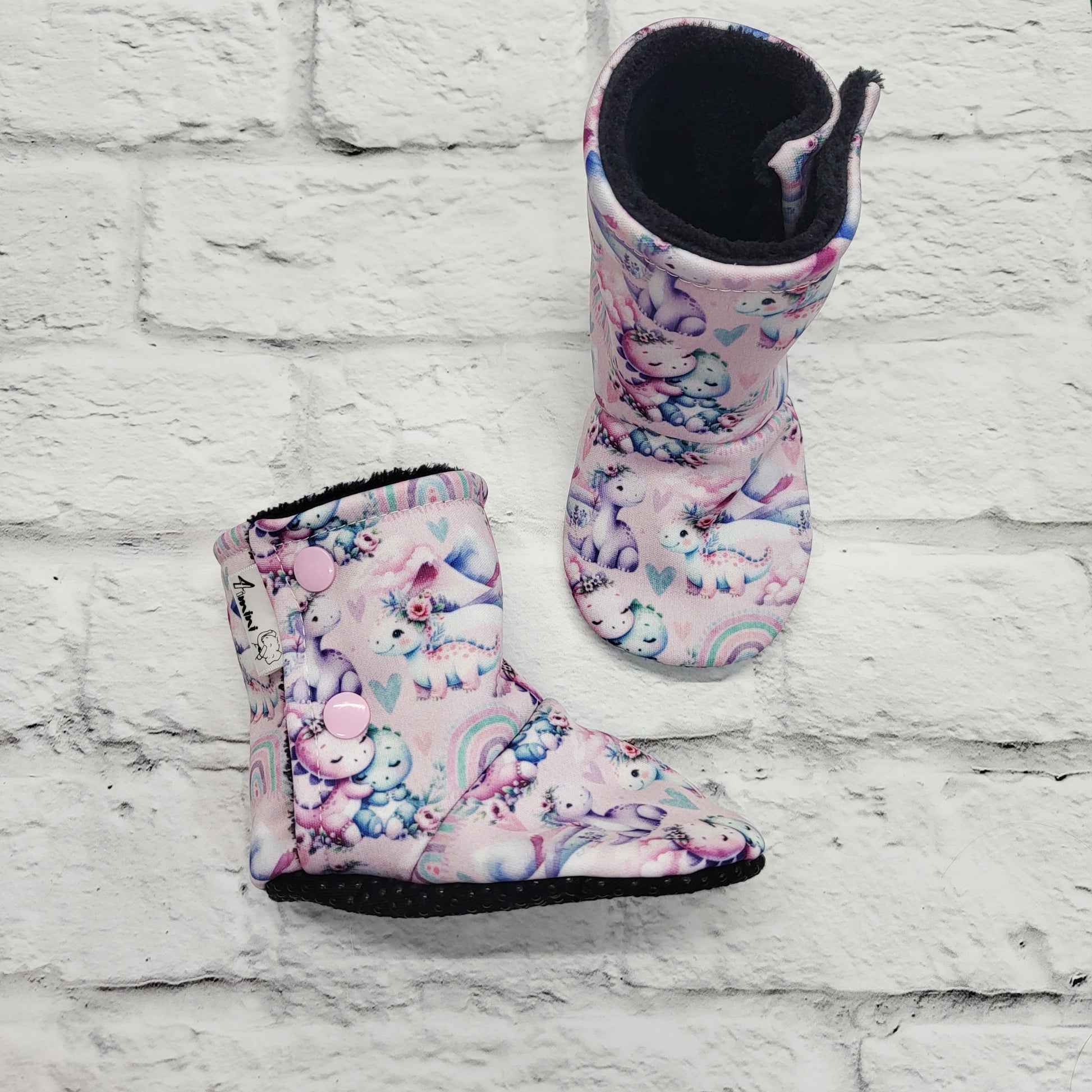 Des boutons pressions de couleurs assortis au motif sont installés sur le côté pour permettre d’ouvrir les pantoufles.