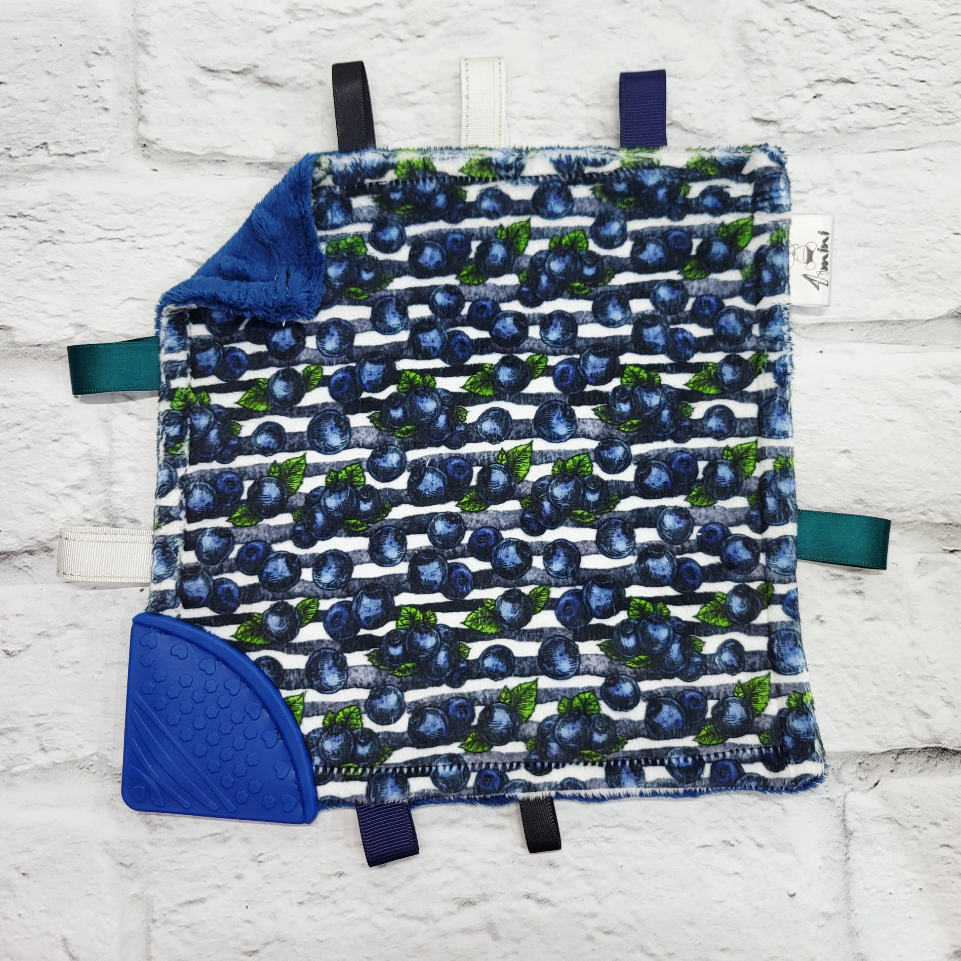 Les lignes de bleuets- Doudou étiquettes avec coin de dentition
