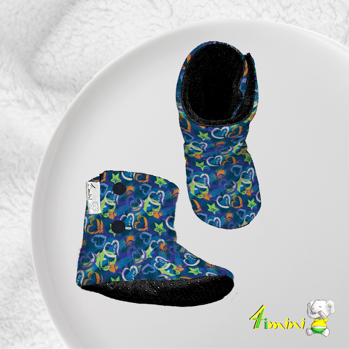 Les grandeurs prématuré, nouveau-né et 3-6 mois sont confectionnées entièrement avec motif, pour les 6-12 mois et plus, elles sont faites avec une semelle antidérapante noire.